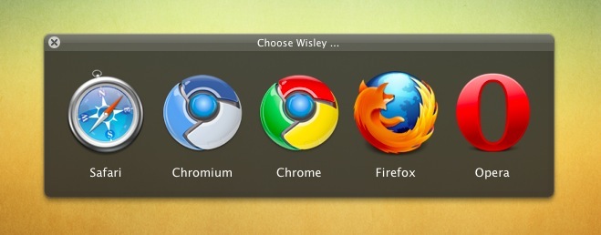Klickt man jetzt auf einen Link zum Beispiel in Mail, kommt eben Choose Wisley hoch und lässt einem die Wahl, in welchem Browser man diesen einen Link öffnen will. Finde ich persönlich sehr praktisch. Choose Wisley konfiguriert man einfach per Drag and Drop. Also einfach den gewünschten Browser aus dem Finder in das Choose Wisley Feld ziehen bzw. auch so einfach wieder rausnehmen zum Entfernen. Die Anzahl der Browser ist bisher auf 5 begrenzt.
