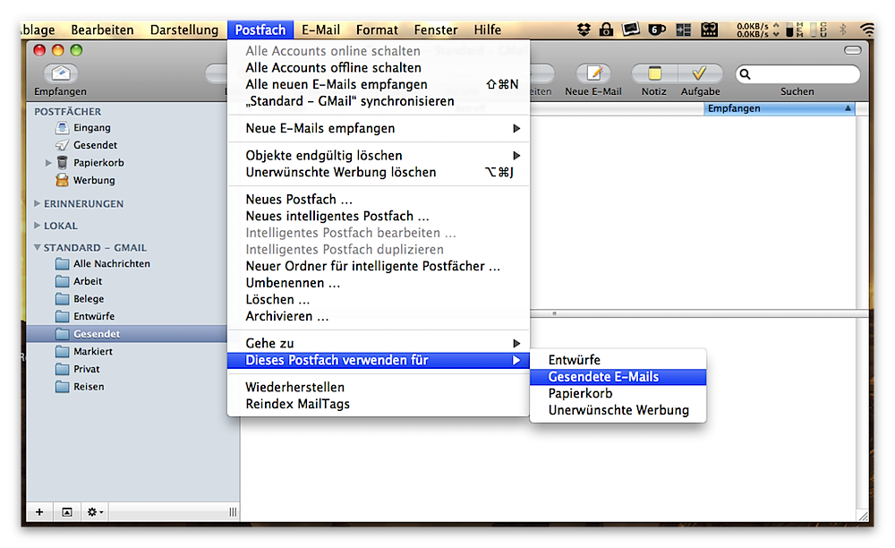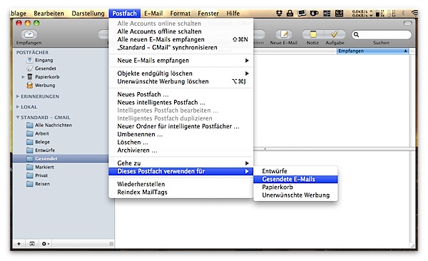 …, die jeweils über das Mail.app-Menu unter Postfach > Dieses Postfach verwenden für zugeordnet werden können.