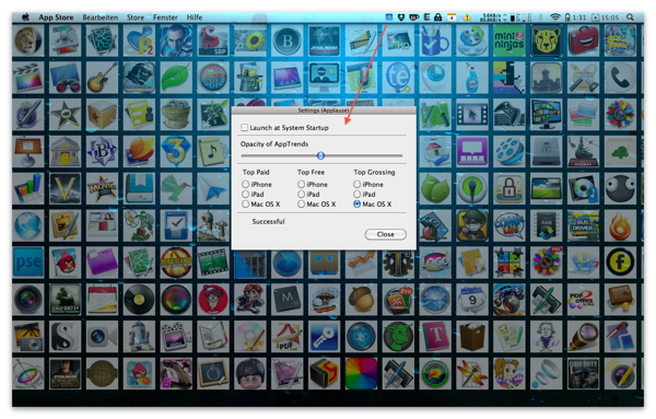 Hier hilft eine App mit dem innovativen Namen Applause, welche gerade kostenlos im Mac App Store herumschwirrt. Die App macht im Prinzip nichts anderes, als sich transparent über das eingestellte Wallpaper zu legen und aktuelle Trends aus dem iOS und Mac App Store anzuzeigen.