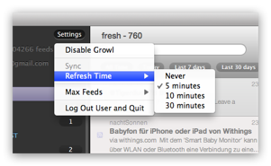 Eine Suche ist ebenfalls integriert, man kann die Updatezeit einstellen oder Growl Notifications zulassen. Darüber hinaus gibt es eine ‚Share-Funktion‘ für Mail, Facebook, Google Plus und Twitter.