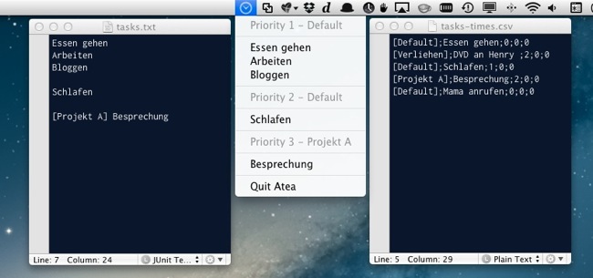 Atea ist ein kleines Tool von Philip Kamenarsky, um Aufgaben zeitlich mitzutracken. Man kann Atea aber auch als einfachen Aufgabenmanager benutzen. Konfigurieren kann man dieses einfache Tool über eine Textdatei und die Ausgabe erfolgt ebenfalls in eine Datei. Wer auf Minimalismus steht, kann sich dieses Open-Source Projekt mal genauer anschauen bzw. es sogar seinen Wünsche anpassen. Die Anzeige und das Starten und Stoppen erfolgt über ein Menübar-Icon.
