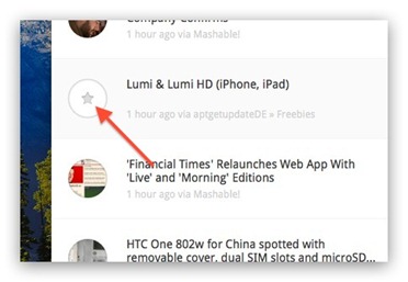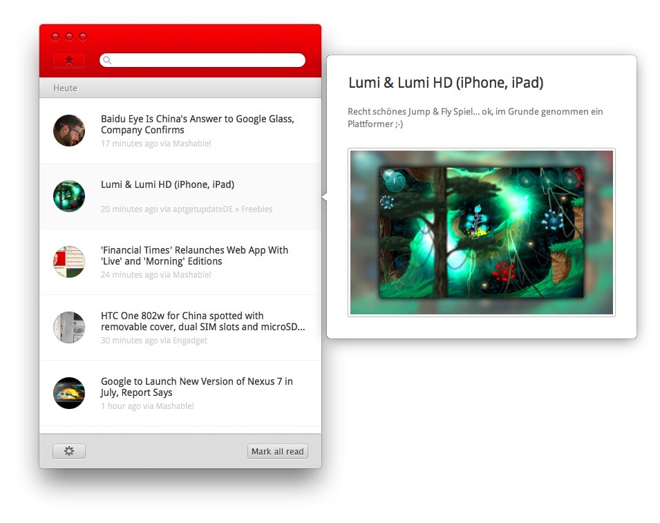 Die Artikel werden zeitlich untereinander in einer Art Liste dargestellt. Das runde Icon vor dem Artikel ‘featured’ ein Bild, welches im Artikel vorhanden ist. Über dieses Icon kann man darüber hinaus Artikel favorisieren. Im oberen roten Bereich ist außerdem noch eine Live-Suche integriert, mit der man Artikel schnell wiederfinden kann.