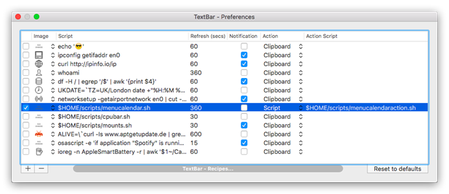 Die einzigen Systemvoraussetzungen sind das kostenlose Kommandozeilentool iCalBuddy und die App TextBar, die ich in einem Review schon mal ausführlicher vorgestellt hatte und mit der man beliebigen Text über Terminal-Kommandos oder eben Scripte in der OS X Menüleiste anzeigen lassen kann.