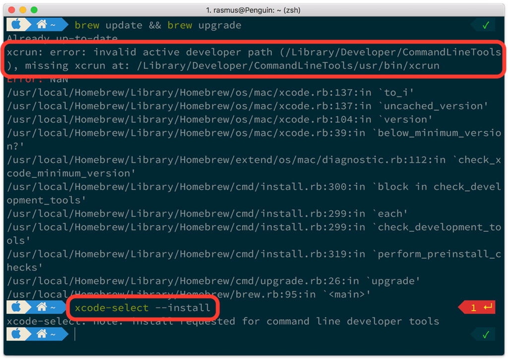 Die Lösung ist denkbar einfach: Man muss die Command Line Tools, die ein kleiner Teil von Apples Entwicklungsumgebung Xcode sind, nur neu installieren. Danach kann man seine Homebrew Pakete wieder problemlos aktualisieren.