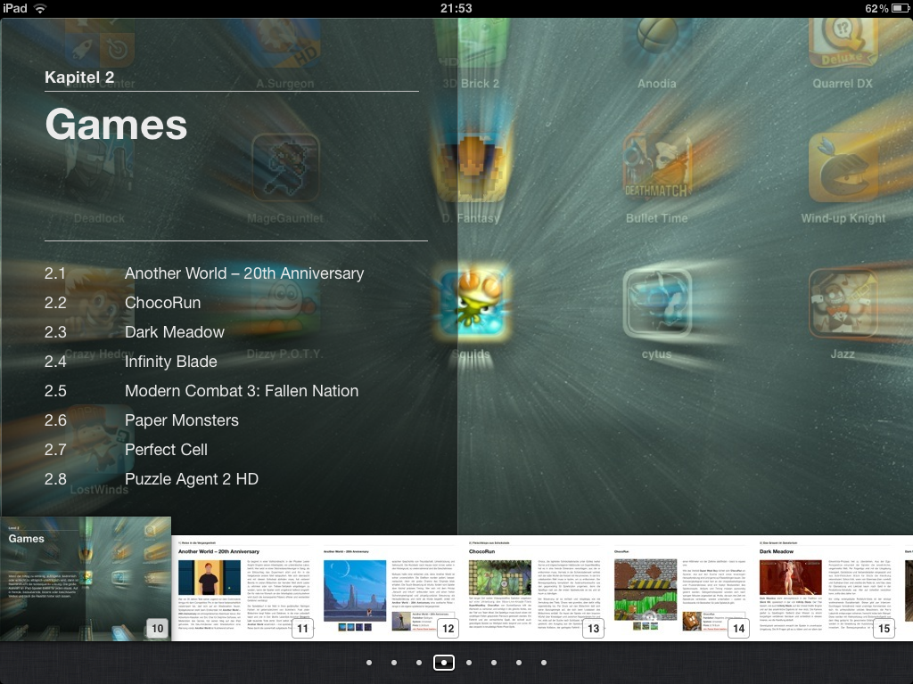 Ein paar Ideen waren schon vorhanden bevor Apple iTunes Author veröffentlichte. Nach der Veröffentlichung habe ich mich dann an die Arbeit gemacht und knapp zwei Wochen lang kontinuierlich geschraubt. Eigentlich wollte ich nur ein kleines App-iBook mit ein paar Rezensionen basteln, aber der erste Entwurf erschien mir dann zu nackt und ich wollte dann ein echtes Magazin. Das Ganze ist dann immer weiter gewachsen. Das Feilen am Layout hat am längsten gedauert und die meiste Zeit gefressen. Ich wollte unbedingt weg von klassischen Print-Layout, das auf dem iPad lieblos wirkt.
