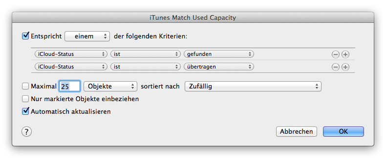Listet alle Songs auf, die iTunes Match zu den 25.000 Songs zählt. In iTunes gekaufte Songs zählen nicht dazu. Die aktuell genutzte Kapazität kann ganz einfach in der iTunes Statusleiste unten abgelesen werden. Somit weißt man auf einen Blick, wie viele Songs für iTunes Match einem noch bleiben.