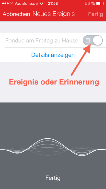 Neu ist dahingegen die Angabe des Alarms, den man über die Keywords Alarm oder Erinnerung inkl. Zeitangabe am Ende des Ereignisses hinzufügen kann.