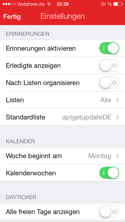 Neben denen im Review schon angesprochenen Einstellungen kann man hier beispielsweise den Standardkalender, die Standardliste für Erinnerungen, die Standard Ereignisdauer sowie einige Dinge zum Erscheinungsbild angeben.
