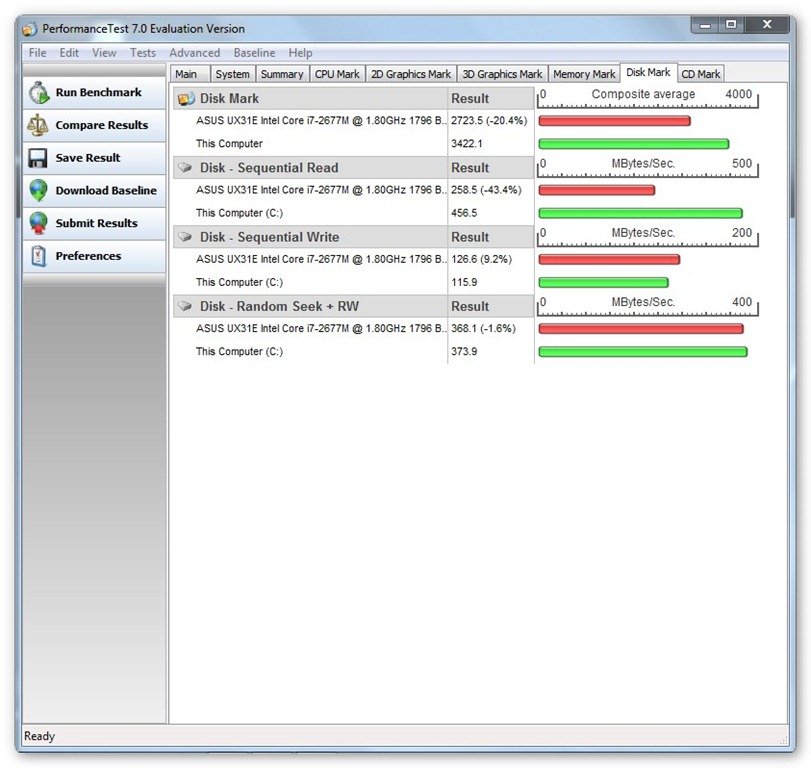 Anschließend habe ich diesen erreichten Wert gegen ein, in der Online-Datenbank von Passmark, gefundenes Vorjahresmodell (Zenbook UX31E) mit Core i7-2677M vergleichen. Kurzum: Die 2te Generation ist überall besser ;)