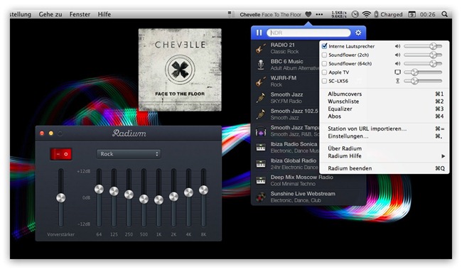 So kann man hier einen 10-Band-Equalizer inkl. diverser Presets und eine Lautsprecheransicht einblenden lassen. Die Lautsprecheransicht ist insofern interessant, als dass man hier den gerade abgespielten Sender (u.a. über AirPlay) auf externe Lautsprecher streamen kann.