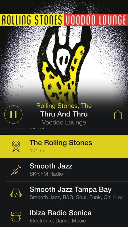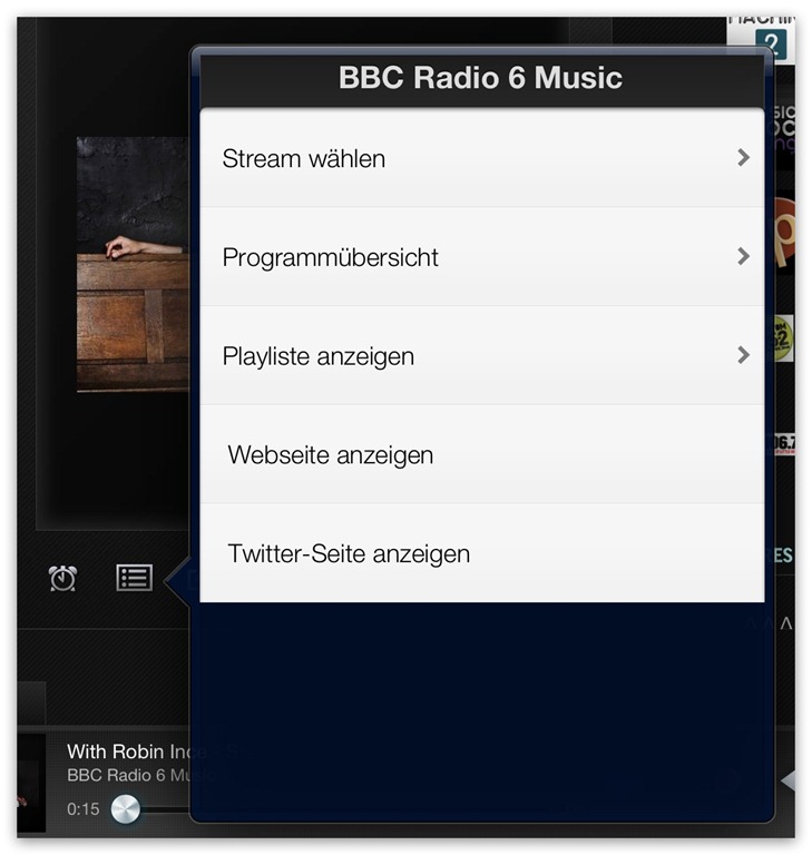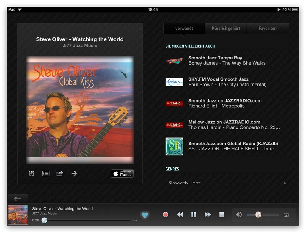 Neben der eigentlichen Radiostation werden im Player auch die Qualität des Streams, der Interpret, der Titel sowie das passende Cover angezeigt. Außerdem kann man unter Gespielte Titel eine History gespielter Songs einsehen und diese über das entsprechende Symbol direkt im iTunes Store bzw. bei Amazon kaufen.
