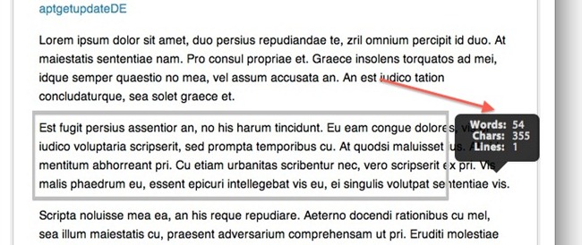 Klickt man diese Zahl an, werden detailliertere Text-Statistiken, wie Anzahl der Wörter oder Sätze, angezeigt, deren Anzeige rechts in den Einstellungen weiter angepasst werden kann.