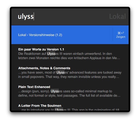 Das wohl wichtigste neue Feature ist aber die vollständige Synchronisation der vorhandenen Bibliothek mit Ulysses für das iPad über die iCloud. Des Weiteren unterstützt die App Handoff, was ein nahtloses Springen zwischen verschiedenen Macs oder auch zur iPad-Version und zurück ermöglicht.